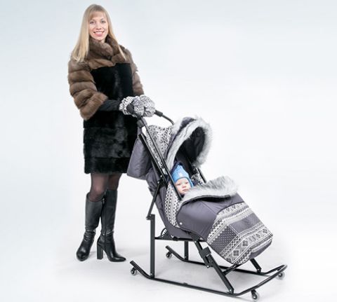 Санки-коляска представляют собой легкую металлическую конструкцию на полозьях с мягким и теплым сиденьем и карманом для ножек. Сплошное сиденье внешне напоминает обычную коляску и имеет регулируемую спинку, поэтому в него можно безопасно садить даже полугодовалого ребенка, и опускать в лежачее положение, когда малыш уснет. Над ними расположен козырек, защищающий малыша от холодного ветра и снега, а сиденье оснащено специальным ремнем безопасности.