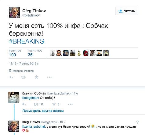 Неожиданно для всех Олег Тиньков переполошил все интернет-сообщество, сообщение с пометкой «срочная новость» - #BREAKING. «У меня есть 100% : Собчак беременна!» (здесь и орфография и пунктуация авторов сохранены, - прим. WomanHit), - написал миллиардер. Естественно, тут же вопросами, от кого, и предполагаемых отцов. Не в стороне и сама Ксения, поинтересовавшись: «От тебя?» На Олег ответил: «У тут было куча версий, но от самая лучшая».
