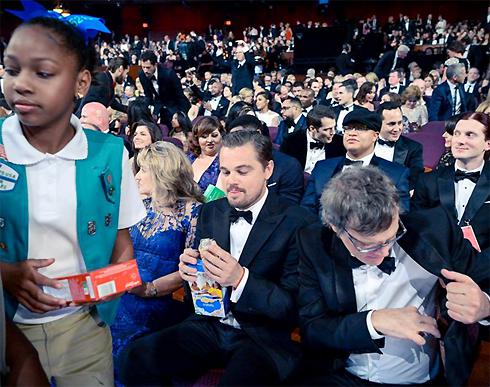 Чтобы во время долгой звезды не проголодались, ведущий шоу Крис Рок решил накормить их печеньем своих дочерей. А заодно подзаработать: не раздавали сладости, а продавали. «Лео, я давно хочу к тебе в карман! И хочу, чтобы ты купил у печенье! Эй, ты тут заработал 30 миллионов долларов. Давай, покупай, не жадничай!» — шутил со сцены Рок, к Ди Каприо. И Леонардо не только купил, но и с стал поглощать печенье. А за за кошельками потянулись и знаменитости.
