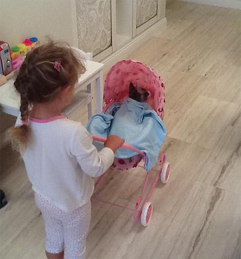 Известная певица MакSим всячески балует свою трехлетнюю дочь Александру и всем ее детским шалостям. На днях исполнительница позволила девочке запеленать кота. Животное с кличкой Кот было уложено в розовую кукольную колясочку и гипотетического ребенка.