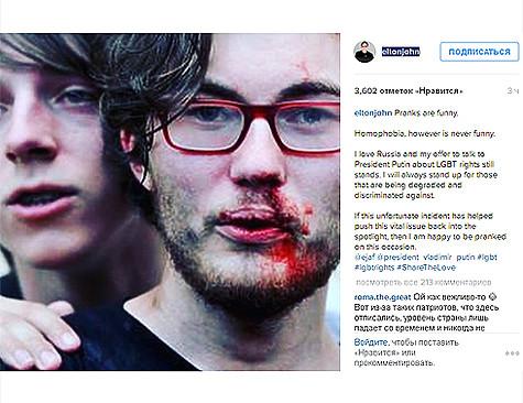 «Розыгрыши – смешно. Гомофобия – не смешно. Я люблю Россию, и предложение поговорить с Путиным о правах представителей ЛГБТ-сообщества остается в силе. Я буду защищать тех, унижают и дискриминируют. Если этот нелепый случай помог внимание к животрепещущему вопросу, то я счастлив, что меня разыграли», – написал музыкант в своем «Инстаграме» под фотографией мужчин, у из которых разбито лицо.