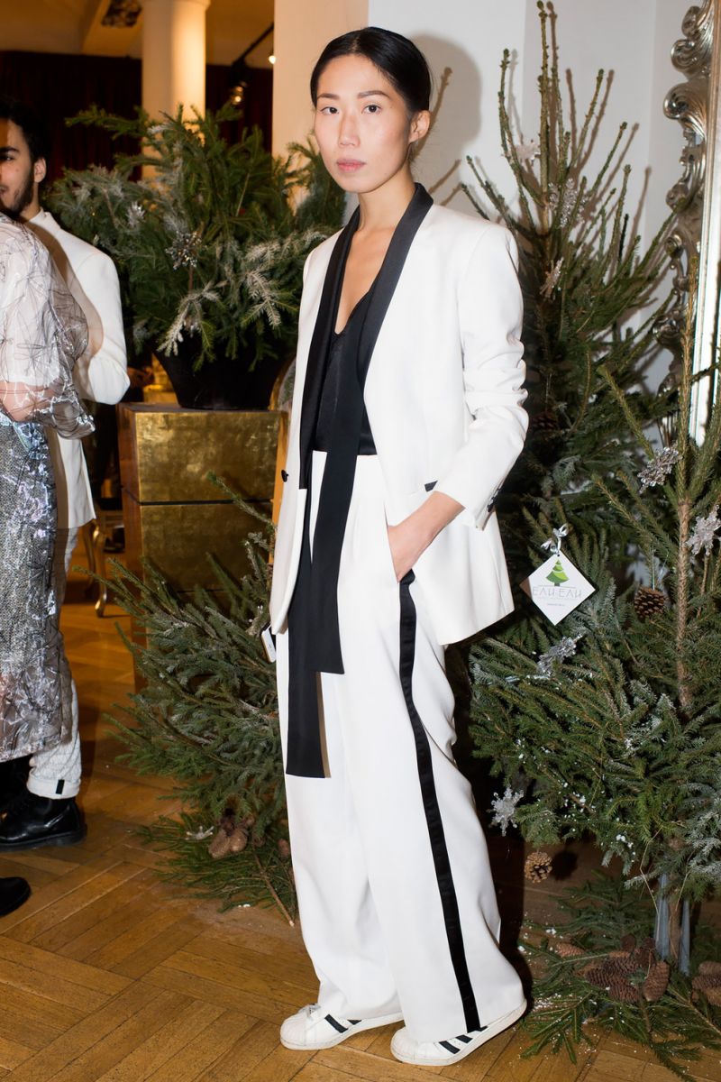 Оксана Он, из самых известных российских it-girls, по-азиатски белый костюм с элементами спорт-шик: брюки с лампасами, крой блейзера-смокинга и, конечно, в качестве вечерней обуви. того, с характерной внешностью сочетаются азиатские мотивы японского кимоно, в воротнике блузы.