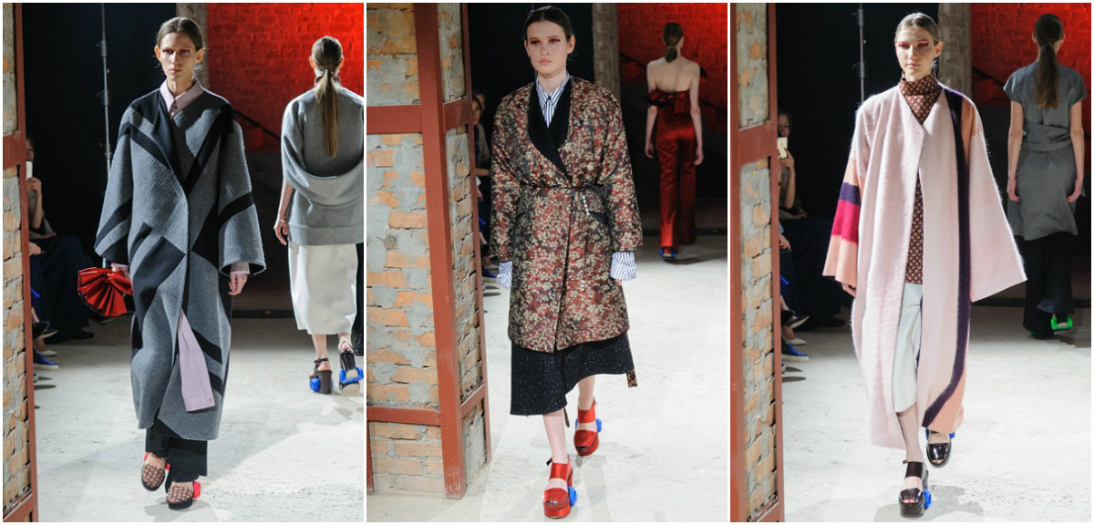 Символическое новой коллекции LITKOVSKAYA на восток. Как и многих в показах сезона осень-зима 2015/16, Литковскую японская культура, в – мастера Хокусая. Переосмысленное в духе современности кимоно, минималистичная ассиметрия, лаконичность, к простоте и геометрии, драпировки, в японском костюме, широкого оби, японки обматывали талию и укладывали сложным на пояснице, а также характерная для японской обуви танкетка и объемные пальто-халаты, рассказывающие длинную и увлекательную историю о своем путешествии из Страны Восходящего Солнца.