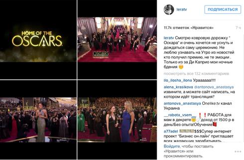 Leratv: «Смотрю ковровую дорожку "Оскара" и очень хочется не уснуть и дождаться саму церемонию. Не люблю узнавать на Утро из кто премию, не те эмоции. из за Ди Каприо мои ночные бдения. я так не «лучшей роли».