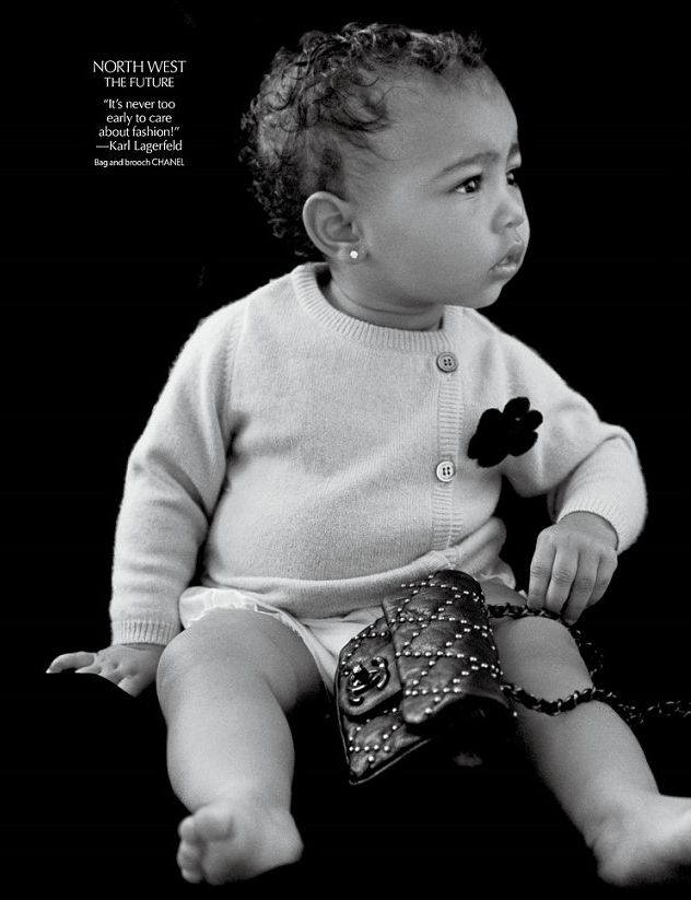 Дочери Ким Кардашьян и Канье Уэста — Норт — исполнилось всего 13 месяцев, когда в появился малышки в Chanel. Рядом с девочкой на черно-белом лежит сумочка той же марки. Снимок для журнала Fashion Book, издает редактор Vogue — Карин Ройтфельд. В левом верхнем углу кадра цитата директора французского бренда Карла Лагерфельда: «Никогда не задумываться о моде!»