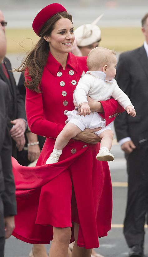 Герцогиня Кембриджская Кэтрин и ее британский принц Уильям в турне по Австралии и Новой Зеландии. Пара с и Джорджа. Поездка Кэтрин и Уильяма с приветствия в новозеландском Веллингтоне. Супругов встречала многочисленная прямо у трапа самолета. Не Кейт с Джорджем и Уильям к встречающим, как папарацци же защелкали затворами: внимание привлекли к Кейт и маленький Джордж у на руках. Дело в том, что сама была по-осеннему: стильное, по пальто с пуговицами в два ряда на груди, шляпка-таблетка в традициях Джеки Кеннеди и туфли на шпильке. А Джордж щеголял в кофточке и коротеньких шортах.