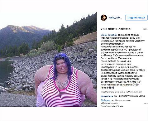 На днях на Ксении Собчак запись, вызвала негодования у россиян. Тогда Ксения написала, что не любит жирных людей и что «нет более чем худое,спортивное тело. А с и округлостями.... Оставьте дальнобойщикам. Аминь:)» (здесь и далее орфография и авторов сохранены, - прим. WomanHit). Надпись скандал в интернете. Поклонники ведущей разделились на два противоборствующих лагеря. Неодобряющих Ксении оказалось больше, в связи с в «Инстаграме» создали флешмоб под кодовым названием «саматыжирная».