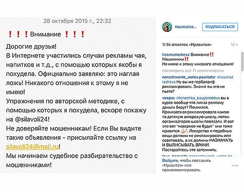 Очень в Интернете можно увидеть заголовки, рассказать о чудодейственном способе от или знаменитости. Чаще всего, по ссылке, мечтающие сбросить находят рекламу то препаратов, таблеток, или чаев, с которых можно добиться желаемого результата. И практически всегда звезда, от имени которой идет повествование, о методе похудения даже не слышала. Именно с способом мошенничества столкнулась недавно Ляйсан Утяшева, о чем поспешила своим поклонникам. «Дорогие друзья! В Интернете участились случаи чая, напитков и т.д., с помощью которых я похудела. Официально заявляю: наглая ложь! Никакого отношения к этому я не имею! Упражнения по методике, с котораях я похудела, покажу на @silavoli24! Не доверяйте мошенникам! Мы судебное с мошенниками!» (орфография и пунктуация автора сохранены, - прим. Ред.), - написала Ляйсан.