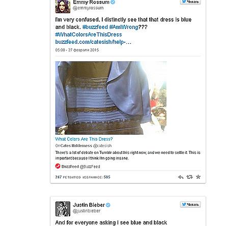 МакНил представить не могла, какой ажиотаж вызовет ее публикация. Ее страничка в Tumblr перестала грузиться из-за числа обращений. Но фото платья разошлось по Сети. В вступили миллионы людей во всем мире. Даже звезды не в стороне. Например, Дэвид Духовны, Тейлор Свифт, Джастин Бибер и Джеймс Франко убеждены, что оно сине-черное. А Джулианна Мур, Ким Кардашьян и Деми Ловато уверены, платье бело-золотое.