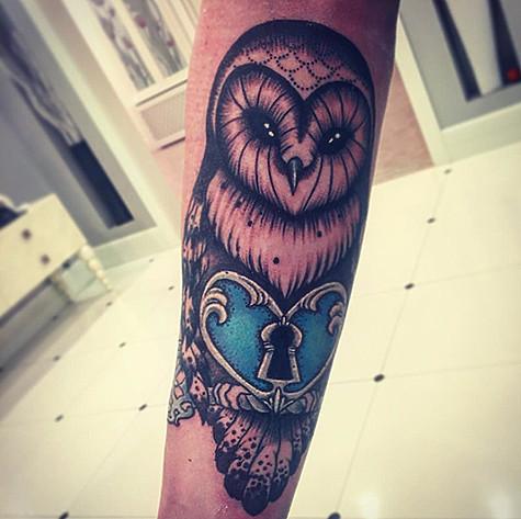 В результате у Никиты теперь на руке красуется прищуренная сова, в держит в сердца. Кстати, его поклонницы же интересоваться, где, собственно, ключ от замочка. А особо глазастые углядели ключ тут же на татушке – в у совы.