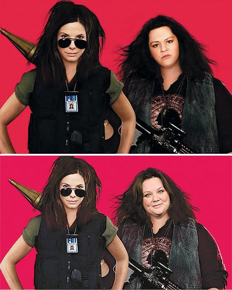 Претензии к к «Копы в юбках» были вызваны изменением внешнего вида одной из исполнительниц главных ролей Мелиссы МакКарти. Известно, что актриса — дама с пышными формами. Да и Мелисса гордится своими округлостями. Однако на плакатах МакКарти благодаря компьютерной графике несколько похудела. Особенно ее лицо. Самые дотошные подсчитали, на звезда сбросила чуть 10 кг. При этом «художники» так перестарались, изменили лица и даже цвет Мелиссы. Впрочем, актриса отнеслась к с юмором.