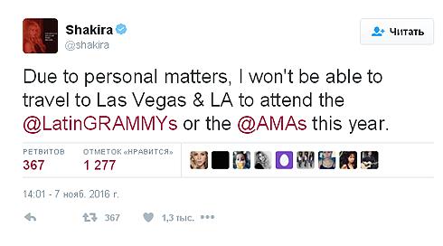 «Из-за личных обстоятельств я не поехать в Лас-Вегас и Лос-Анджелес, чтобы присутствовать на Латинской Грэмми и AMAs года», — написала Шакира. Других подробностей 39-летняя сообщать не стала, подписчики звезды тут же решили, она беременна.