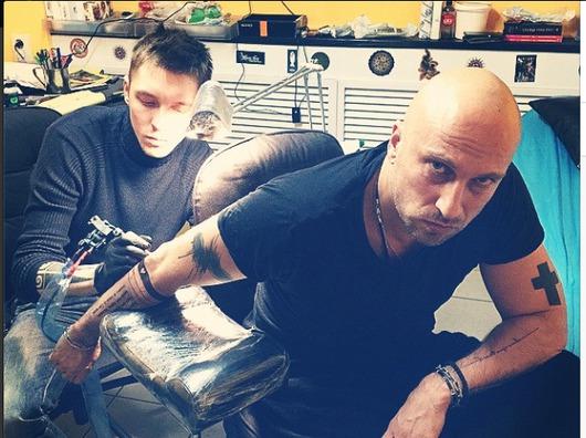 Сын Дмитрия Нагиева опубликовал фото отца, на котором видно, мастер делает на его правой татуировку. Фото: социальные сети