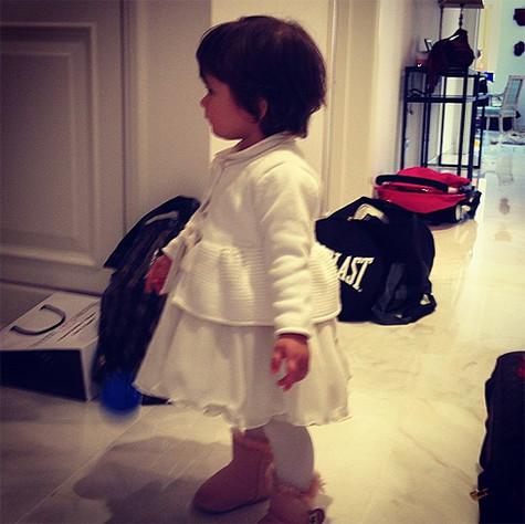 «Мой маленький ангел!» — Виктория фото, на котором Анджелина изображена, стоящей посреди коридора, в пышном белом платьице и розовых уггах.